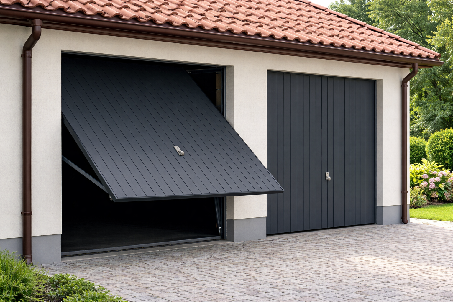 Classique et robuste, la porte basculante est une solution simple et économique. Elle existe en version manuelle ou motorisée.
