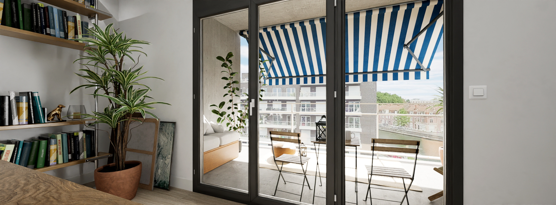 Pour les terrasses extérieures : le store à double pente est une option idéale. Réalisé sur-mesure, il est 100% auto-porté et existe en version motorisée ou manuelle. C’est LE store préféré des terrasses de cafés et restaurants.
